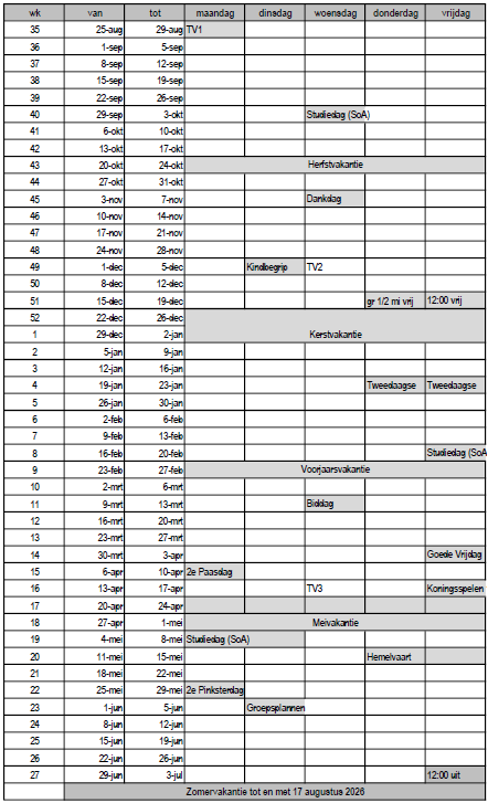 Toelichting: de grijze vlakken zijn de leerlingen vrij.